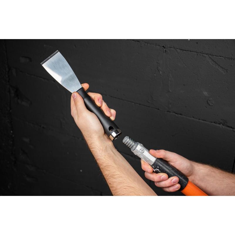 Szpachelka-skrobak long 75 mm MOTIVE to narzędzie z grubym, 75 mm stalowym ostrzem do zeskrobywania powłok malarskich i tapet. Wygodny uchwyt z gwintem umożliwia korzystanie z kija teleskopowego dla pracy na różnych wysokościach, a metalowy pierścień na końcu ułatwia uderzanie młotkiem przy usuwaniu trudnych do usunięcia mas.