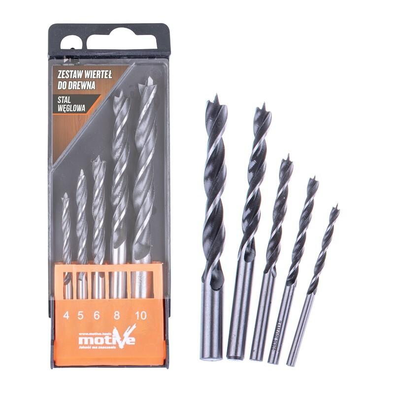 Wiertła wykonane z najwyższej jakości stali węglowej marki Motive. Zestaw wierteł do drewna: krętych z ostrzem centrującym i chwytem walcowy.