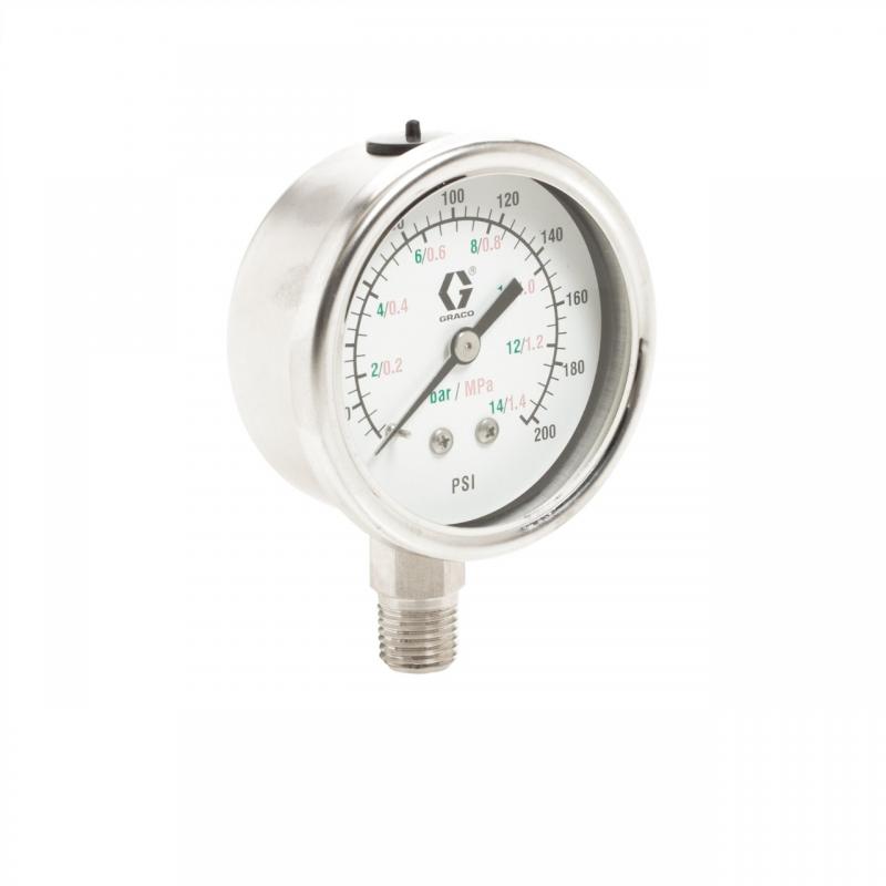 Niskociśnieniowy manometr cieczowy ze stali nierdzewnej, zakres ciśnienia 0–100 psi (0–7 bar) marki Graco.