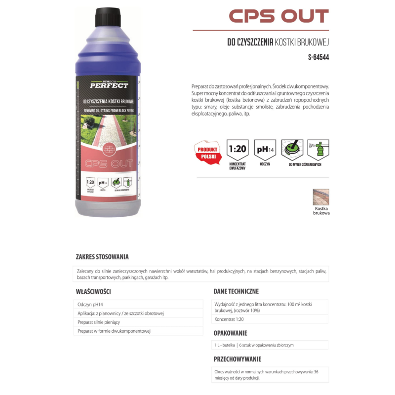 Preparat dwuskładnikowy o odczynie pH 14, koncentrat 1:20. Wydajność: do 100 m² z 1 litra koncentratu (roztwór 10%). Do aplikacji z pianownicy lub szczotki obrotowej. Skład: 5–15% niejonowe środki powierzchniowo czynne, <5% fosfoniany. Opakowanie: 1 L, minimalne zamówienie: 6 sztuk. Brak danych o dodatkowej zawartości zestawu.
