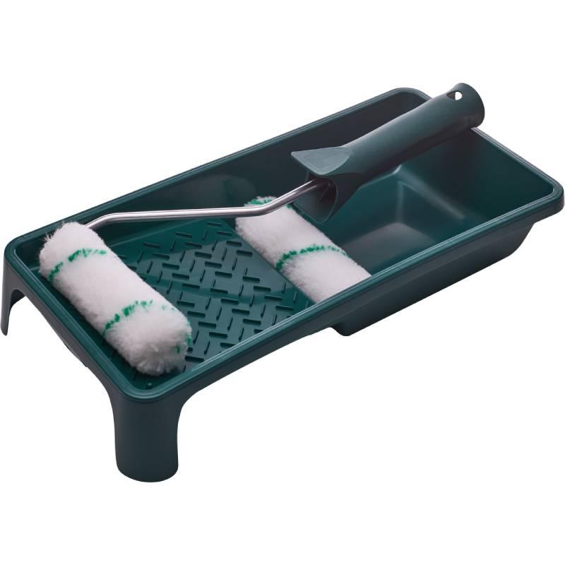 Profesjonalny zestaw malarski STALCO to idealne rozwiązanie dla osób malujących ściany i sufity farbami o wysokiej gęstości, w tym farbami dwuskładnikowymi i jednokrotnego krycia. Wałki z zieloną nicią wykonano z wytrzymałej tkaniny odpornej na ścieranie i działanie rozpuszczalników, co zapewnia trwałość i precyzję podczas pracy. Kuweta o wymiarach 150x290 mm umożliwia wygodne dozowanie farby, a uchwyt pasuje do dołączonych wałków, tworząc kompletny zestaw do malowania.