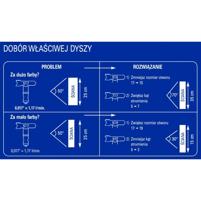 Ostatnie dwie cyfry "17" oznaczają szerokość otworu dyszy wyrażoną w calach (0,017" lub 0,43mm) oraz wyznaczają maksymalny przepływ farby ( dla dyszy 517 jest to ~1,2 l/min ).
